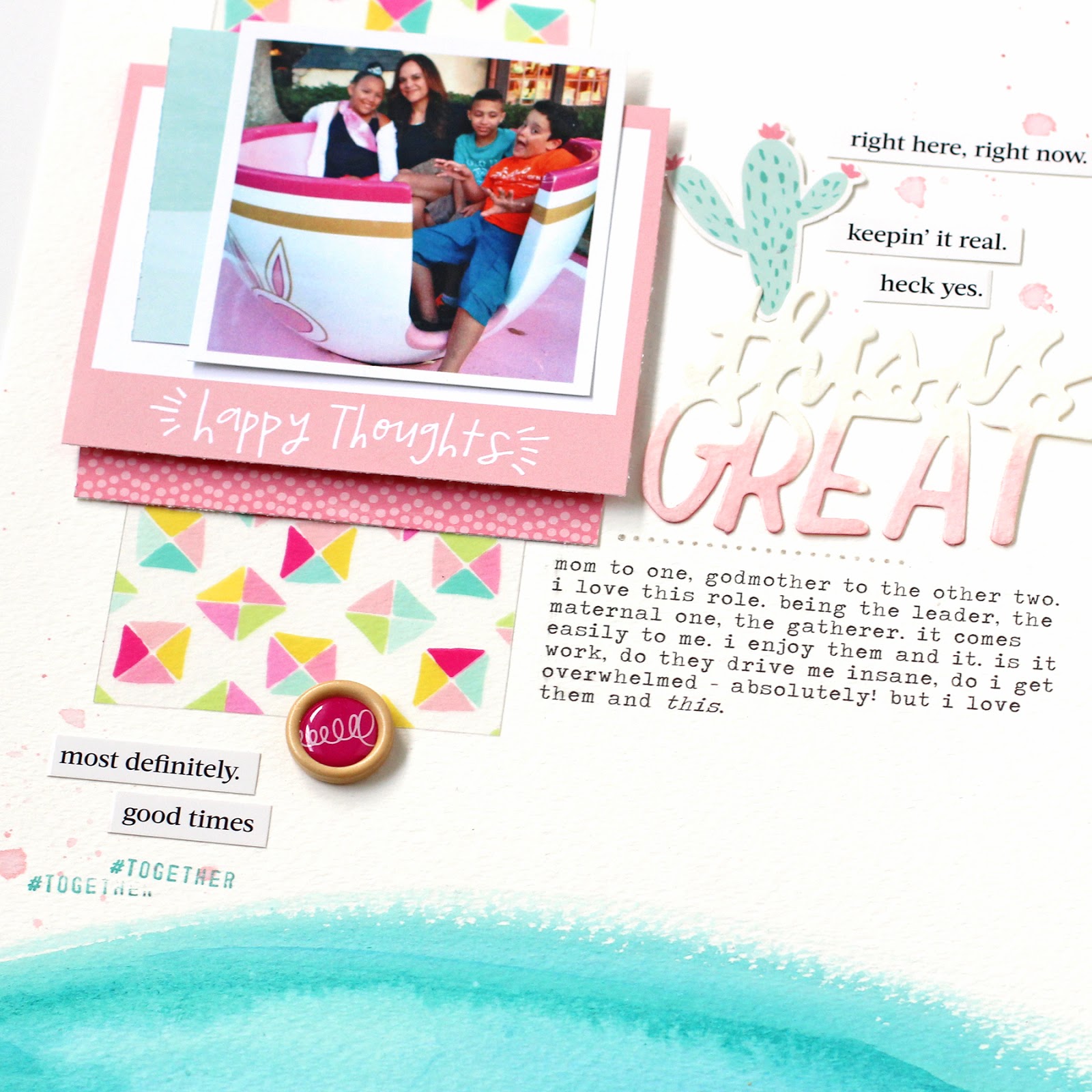 A departure from all the vacation layouts, here I used the Happy Collection to make an everyday page about the little people in my life and being a Mom. Using the same watercolored word die cut pack, I customized this one with a light pink color wash. I love that the pack of die cut words comes both pre-printed and plain on watercolor paper so that I can use it in a variety of ways!